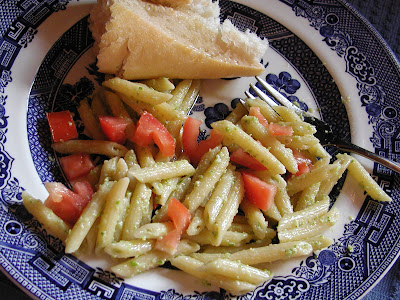 If you are using this on pasta, the recommended amount is 2 tablespoons per 1/2 pound of pasta. I cooked a pound of the cute mini penne pasta and used 6 tablespoons of pesto. I'll leave it up to your taste buds. I also chopped up some fresh tomato and stirred that into mine. (The boys are anti-tomato!) I can't begin to tell you how yummy this was!